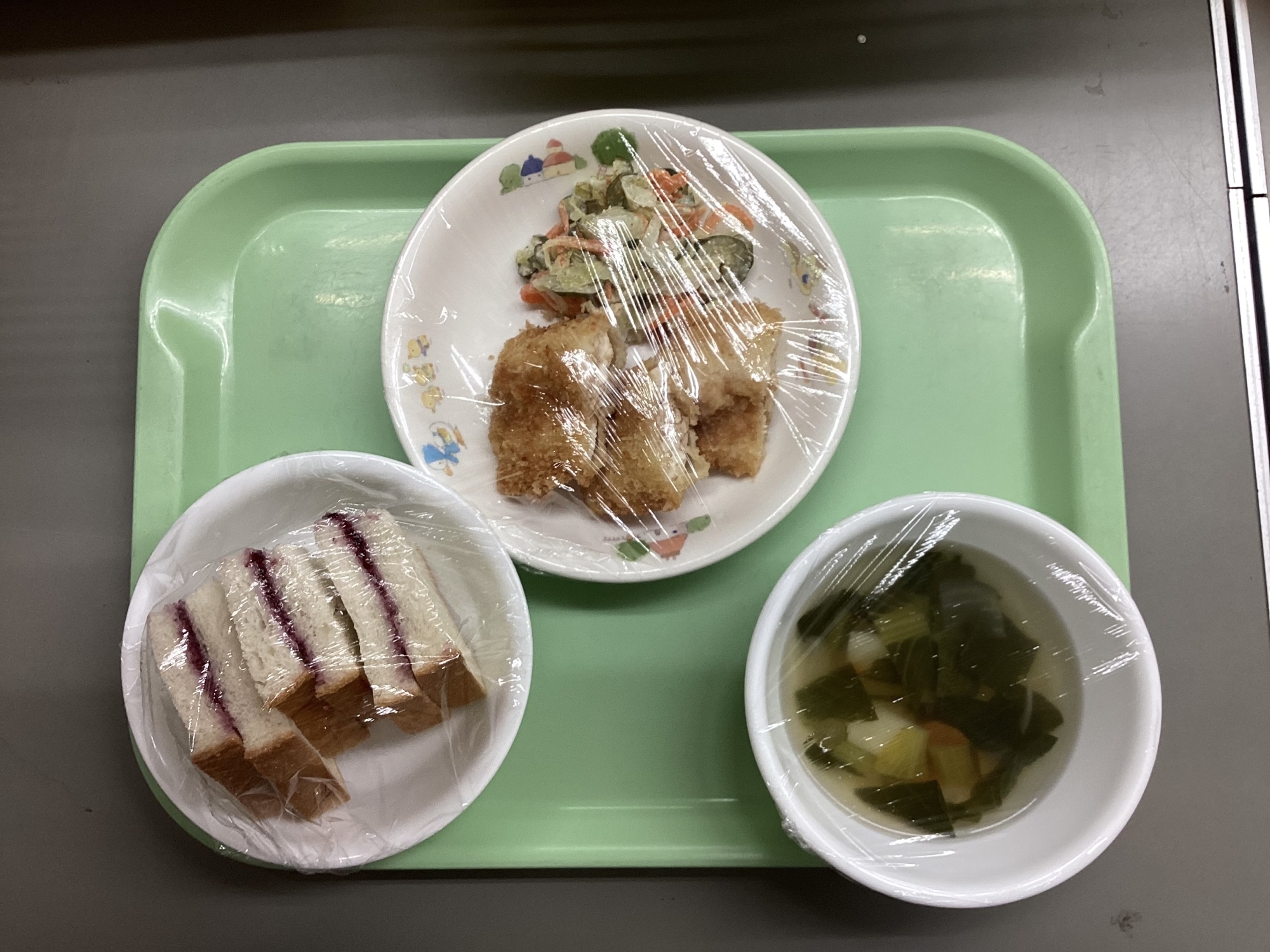 昼食は、『食パン』、『ささみフライ』、『コールスロー』、『野菜スープ』